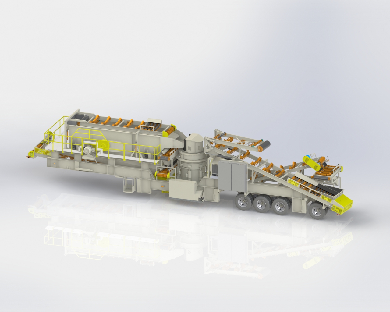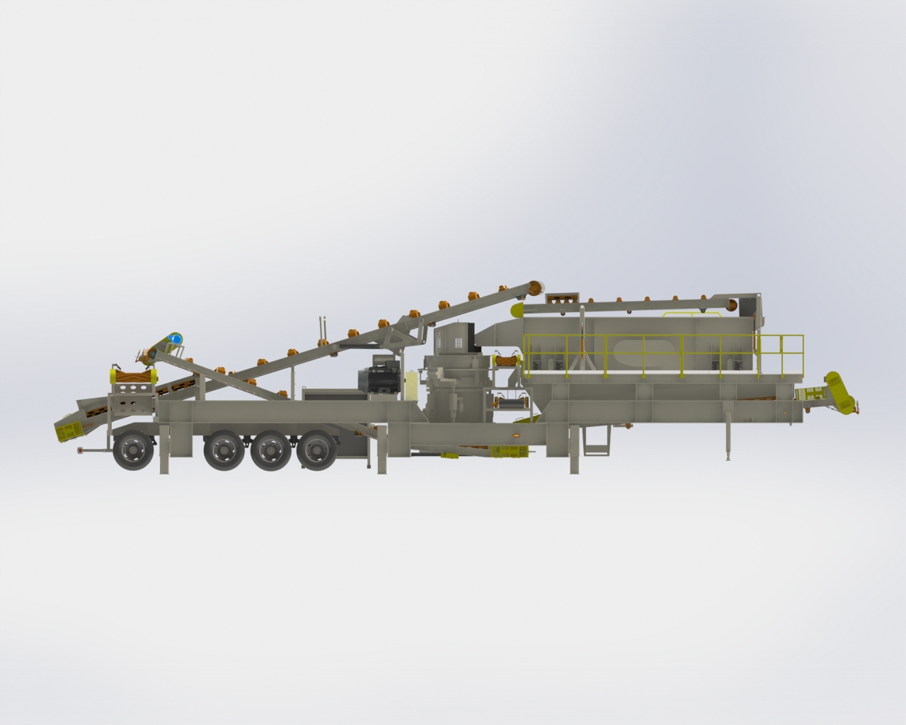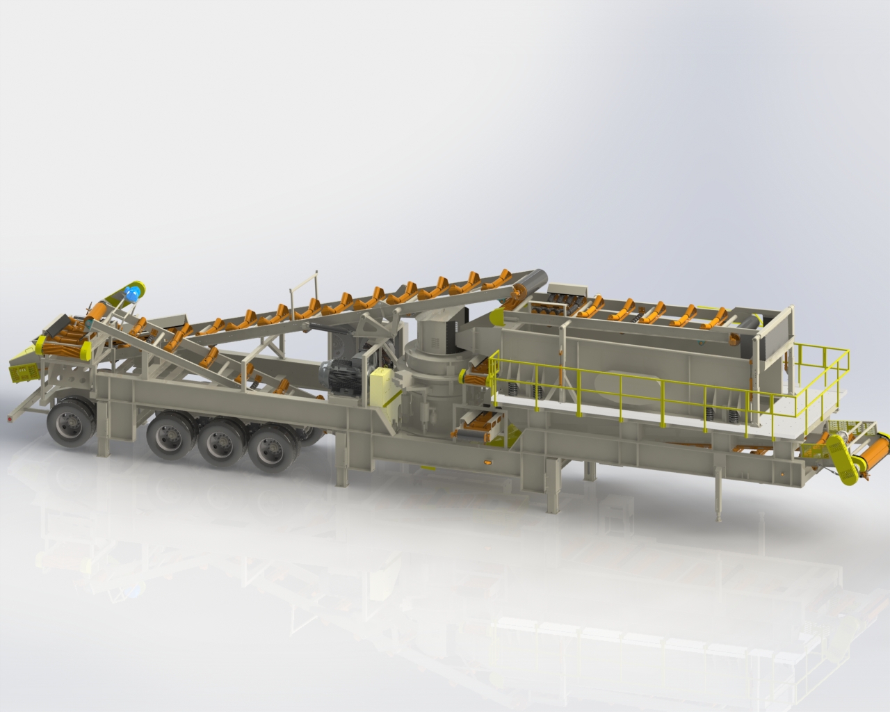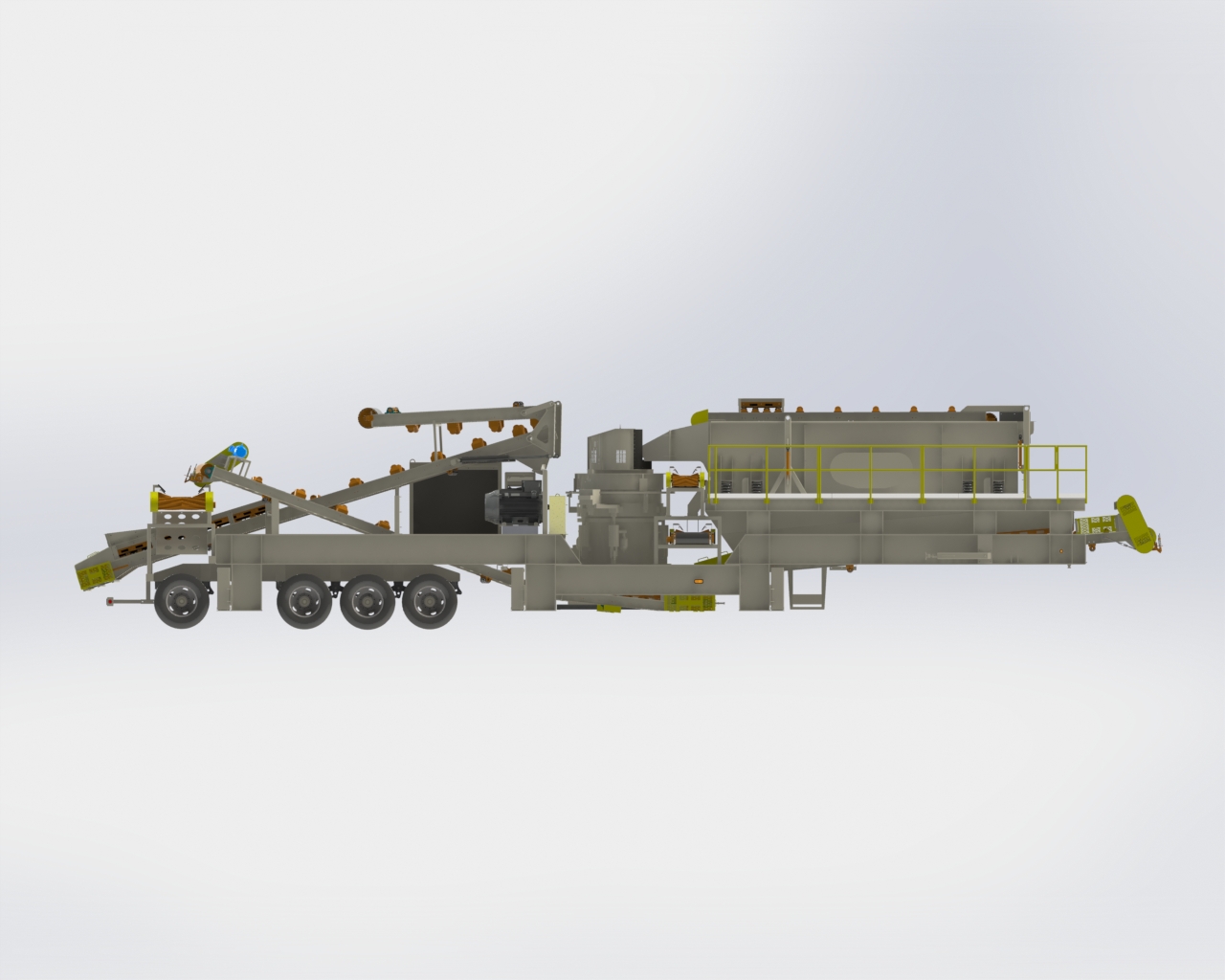 24” 84# Mainbeam with Quad-Axle Hutch Suspension equipped for semi trailer towing with 11:00 R 22.5 tires on Budd type wheels, air controlled brakes, fifth wheel kingpin, horizontal screen support frame with diamond plate catwalks, conveyor supports, travel lights, reflectors, mud flaps, crusher motor mounting parts and V-Belt drive guards